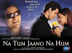 Na Tum Jaano Na Hum (transl. Neither you nor I know) is a 2002 Indian Hindi-language romantic drama film starring Hrithik Roshan, Saif Ali Khan and Esha Deol. The film was directed by Arjun Sablok and produced by Future Group owner Kishore Biyani. The title of the film was taken from the song of Roshan's debut film Kaho Naa Pyaar Hai. Upon release, it met with extremely negative reviews and was a box office disaster despite having a stellar cast.