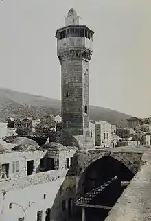 The 1927 Jericho earthquake destroyed many of the Nablus' historic buildings, including the An-Nasr Mosque.[26] Though they were subsequently rebuilt by Haj Amin al-Husayni's Supreme Muslim Council in the mid-1930s, their previous "picturesque" character was lost. During British rule, Nablus emerged as a site of local resistance and the Old City quarter of Qaryun was demolished by the British during the 1936–1939 Arab revolt in Palestine.[27] Jewish immigration did not significantly impact the demographic composition of Nablus, and it was slated for inclusion in the Arab state envisioned by the United Nations General Assembly's 1947 partition plan for Palestine.[28]