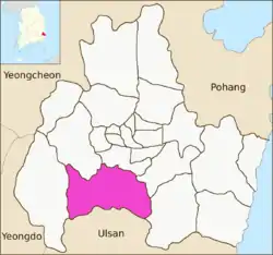 Naenam-myeon is a myeon or a township in the administrative subdivisions of the Gyeongju City, North Gyeongsang province, South Korea. It is bordered by Geumo Mountains on the east, Jusa Mountains on the south. Its 122.05 square kilometers are home to about 6,142 people.[1] This population is served by one elementary school and one high school.[2]