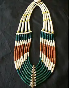 The Naga people love colour as is evident in the shawls designed and woven by women, and in the headgear that both sexes design. Clothing patterns are traditional to each group, and the cloths are woven by the women. They use beads in variety, profusion and complexity in their jewelry, along with a wide range of materials including glass, shell, stone, teeth or tusk, claws, horns, metal, bone, wood, seeds, hair, and fibre.[10]