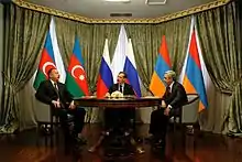 Russia is officially neutral and has sought to play the role of a mediator.[187][188][189] In its official statements, Russia calls for a peaceful settlement and restraint during skirmishes.[190] British journalist Thomas de Waal has argued that there is an Azerbaijani narrative that Russia has "consistently supported the Armenian side." According to de Waal, Russia "has more supported the Armenian side," but there have been various "different Russian actors at different times supporting both sides in this conflict." He argues that President Boris Yeltsin did not "want to see the Armenian side be defeated, but he also didn't want to supply them with too many weapons." De Waal concluded in 2012 that "Russia [is] playing both sides", but "ultimately more in the Armenian side."[191] Other commentators have argued that Russia plays both sides in the conflict.[192][193] Svante Cornell argued in 2018 that Russia "had been playing both sides of the Armenia-Azerbaijan conflict to gain maximum control over both, a policy that continues to this day."[194]