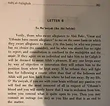 - Letter 75, After all Muslims accepted Ali ibn Abi Talib as the rightful caliph, he wrote this letter to Muawiyah I. In it Ali tells Muawiyah I to pay his oath of allegiance to him.