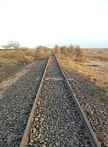 The station had a metre-gauge railway line laid in 1980 to get connected with the town of Bhuj. The line was abandoned later since Gandhidham–Bhuj section got converted to broad gauge and this 101.24 km line became isolated. Recently gauge conversion to broad gauge has been approved by the Government of India in June 2016, so that it can be used for public, military or freight purpose.[1][2][3][4][5] In 2018 the railway section between Bhuj and Deshalpur village (28 km) was commissioned, remaining under gauge conversion Deshalpur–Naliya section (74 km).