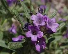 Nama lobbii is a rhizomatous perennial herb forming dense mats of glandular hairy to woolly herbage usually spreading more than a meter wide. The sticky, hairy oval leaves are up to six centimeters long, occurring alternately along the branching stems and in clusters at stem forks. The funnel-shaped flowers are just under a centimeter wide with five rounded lobes. They are deep pink to purple in color. The plant sends out wide root networks which can grow up to five meters in length per year and sprout new plants.[1]