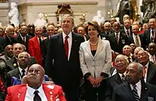In the 2006 midterm elections, the Democrats took control of the House, picking up 30 seats.[31] The change in control meant as House minority leader, Pelosi was widely expected to become Speaker of the House in the next Congress.[32][33] On November 16, 2006, the Democratic caucus unanimously chose Pelosi as the Democratic candidate for Speaker.[34]