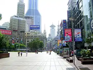 Nanjing Road (Chinese: 南京路; pinyin: Nánjīng Lù; Shanghainese: Nuecin Lu) is a road in Shanghai. The eastern part of Nanjing Road is the main shopping streets of Shanghai, China, and is one of the world's busiest shopping streets along with Fifth Avenue and Times Square.[1] The street is named after the city of Nanjing, capital of Jiangsu neighbouring Shanghai. Today's Nanjing Road comprises two sections, Nanjing Road East[2] and Nanjing Road West.