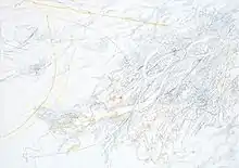 Taking as point of departure the fleeting and metaphoric aspect of clouds and the views out of airplane windows, since 2000 Meyer has been investigating specific aspects of perceptual/spatial experiences. In the works titled "Papierperspektive" ("Paper Perspectives"), various simultaneous points of view and the abstraction of seeing are formulated by means of lines and superimposed with graphic conventions drawn from meteorology and cartography. Emergent are dynamic, floating spaces with multiple perspectives which do not allow the gaze to come to rest. For the artist these drawings are both perceptual reflections of space as well as "thinking conduits".[7] Nanne Meyer's work, including further images not included in this article, is documented on the artist's Official website.