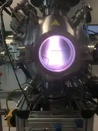 The plasma is created by a Cascaded Arc Plasma Source,[1] which exhausts into the spherical vacuum vessel. Gases such as Helium, Hydrogen, Nitrogen, Argon, Xenon can be used to create plasma. Samples are mounted in direct view of the plasma. The plasma species interact with the atoms of the sample, leading to surface modifications. In general this process is called plasma processing.