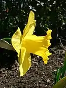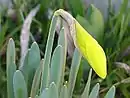 Narcissus plants have one to several basal leaves which are linear, ligulate or strap shaped (long and narrow), sometimes channelled adaxially to semiterete, and may (pedicellate) or may not (sessile) have a petiole stalk.[8] The leaves are flat and broad to cylindrical at the base and arise from the bulb.[9] The emerging plant generally has two leaves, but the mature plant usually three, rarely four, and they are covered with a cutin containing cuticle, giving them a waxy appearance. Leaf colour is light green to blue-green. In the mature plant the leaves extend higher than the flower stem, but in some species the leaves are low hanging. The leaf base is encased in a colourless sheath. After flowering the leaves turn yellow and die back once the seed pod (fruit) is ripe.[4]