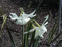 The "triandrus" form is seen in only two species, N. albimarginatus (a Moroccan endemic) and N. triandrus. It combines features of both the "daffodil" and "paperwhite" forms, with a well-developed, long, narrow tube and an extended bell-shaped corona of almost equal length. The flowers are pendent.[15]