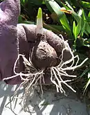 The pale brown-skinned ovoid tunicate bulbs have a membranous tunic and a corky stem (base or basal) plate from which arise the adventitious root hairs in a ring around the edge, which grow up to 40 mm in length. Above the stem plate is the storage organ consisting of bulb scales, surrounding the previous flower stalk and the terminal bud. The scales are of two types, true storage organs and the bases of the foliage leaves. These have a thicker tip and a scar from where the leaf lamina became detached. The innermost leaf scale is semicircular only partly enveloping the flower stalk (semisheathed).(see Hanks Fig 1.3). The bulb may contain a number of branched bulb units, each with two to three true scales and two to three leaf bases. Each bulb unit has a life of about four years.[4][5]