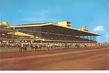On May 18, 1934, Rhode Island voters approved a measure legalizing parimutuel betting by an almost 3 to 1 margin.[1] The following day, the Narragansett Racing Association announced plans for a $1 million race track and steeplechase course on the site of the former What Cheer Airport and filed articles of incorporation with the Secretary of State of Rhode Island.[2] The Association chose to name their track after Narragansett Park, a former trotting park in Pawtucket, Rhode Island.[3] On June 6, 1934, the Narragansett Racing Association was awarded the state's first horse racing permit.[4] Construction was completed in less than two months at a cost of $1.2 million.[5] The track consisted of a one-mile racing oval, a 14,000 seat grandstand, 270 betting and paying booths, a clubhouse, and 22 barns with stalls that could hold more than 1,000 horses.[3][6][7] The City of Pawtucket constructed a new four-lane highway leading to the entrance of the track and a double track railway was built near the stands.[8]
