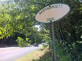 ![]() Narragansett Trail "white oval" sign at junction of Connecticut State Route 2 and Ryder Road. | |