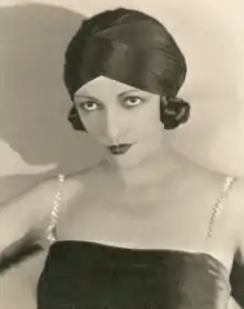 Rambova's clothing designs drew on various influences, described by fashion critics as blending and re-working elements of Renaissance, 18th-century, Oriental, Grecian, Russian, and Victorian fashion.[115][116] Common preferences in her work included the dolman sleeve, long skirts with high waists, premium velvets, and intricate embroidery,[71] as well as incorporation of geometric shapes and use of "vivid colors ... that are violent and definite. Scarlets, vermilions, strong blues, [and] blazoning purples."[71] She was cited as influential by several designers with whom she worked, including Norman Norell, Adrian, and Irene Sharaff.[72] Rambova typically dressed in the style of her designs, and thus her personal style was also influential: She often wore her hair in coiled "ballerina style" braids,[117] sometimes covered in a headscarf or turban, with dangling earrings and calf-length velvet or brocade skirts.[118] Actress Myrna Loy once proclaimed Rambova the "most beautiful woman she'd ever seen."[118] In 2003, Rambova was posthumously inducted into the Costume Designers' Guild Hall of Fame.[72]