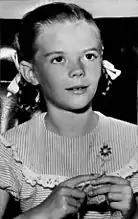 A few weeks before her fifth birthday, Wood made her film debut as a character actress in a fifteen-second scene in the film Happy Land (1943). Despite the brief part, she attracted the notice of the director, Irving Pichel.[29] He remained in contact with Wood's family for two years, advising them when another role came up. The director telephoned Wood's mother and asked her to bring her daughter to Los Angeles for a screen test. Wood's mother became so excited that she "packed the whole family off to Los Angeles to live," writes Harris. Wood's father opposed the idea, but his wife's "overpowering ambition to make Natalie a star" took priority.[30] According to Wood's younger sister Lana, Pichel "discovered her and wanted to adopt her."[31]