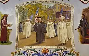 In November 1917, the suffrage movement achieved a major victory when a referendum to enfranchise women passed by a large margin in New York, the most populous state in the country.[121] The powerful Tammany Hall political machine, which had previously opposed suffrage, took a neutral stance on this referendum, partly because the wives of several Tammany Hall leaders played prominent roles in the suffrage campaign.[122]