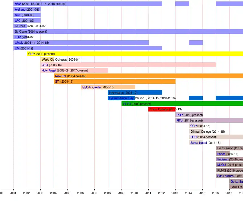 | Enderun Colleges | Titans | Junior Titans | Lady Titans | Private | 2005 | Non-Sectarian (200-400) | Bronze & Burgundy | McKinley Hill, Bonifacio Global City, Taguig City |