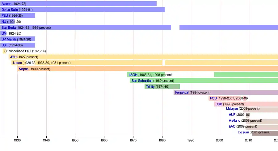 | San Beda University | 1901 as El Colegio de San Beda[8] | Red Lions | Red Lionesses | Red Cubs | Private/Catholic Order of Saint Benedict | 1924–1983, 1986–present | |||||||