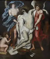 Flemish art school is represented by remarkable pieces including “Procession of Silenus” by Peter Paul Rubens,[13] “Descent from the Cross” by Anthony van Dyck,[14] outstanding still-life paintings by Verbruggen and Jan Fyt and “Mountain landscape” by Joos de Momper. Portrait genre is represented by several canvases,[15] most notable ones are woman portrait by Pieter Pourbus and portrait by unknown artist of the 17th century. Two works of David Teniers the Younger disclose genre painting. Work of comparatively little-known artist Jan Cossiers “Faun visiting peasants” is an example of realism art.