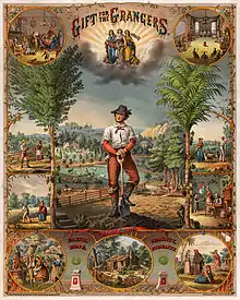 The Grange, officially named The National Grange of the Order of Patrons of Husbandry, is a fraternal organization in the United States that encourages families to band together to promote the economic and political well-being of the community and agriculture.[1] The Grange, founded after the Civil War in 1867, is the oldest American agricultural advocacy group with a national scope. The Grange actively lobbied state legislatures and Congress for political goals, such as the Granger Laws to lower rates charged by railroads, and rural free mail delivery by the Post Office.