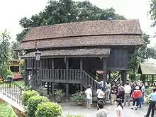 The restored palace is a wooden house designed for the tropics, with stilts that allow air to circulate freely under the building and a steep thatch roof to cool the interior. There are intricate wood carvings on the doors and windows.
