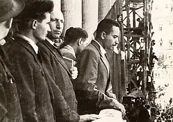 Initially, the UP itself acknowledged that it had a short-term role, presenting itself not as a party, but as a big tent movement of antifascists and PCdR members, irrespective of ethnicity, social class, or creed.[129] Members called each other prieten ("friend"), mirroring the communist tovarăș ("comrade").[130][131] In a December 1944 address to the people, Novacu presented the August 23 Coup as top-down seizure of power, rather than as a popular revolution, noting that the action of a few would "impel and enrich the populace".[132] At around the same time, Vlădescu-Răcoasa was claiming that, in the "new world", it would matter not whether "one is a bourgeois or a proletarian, but if one is a democrat". The one "true democracy", he indicated, was a people's democracy.[133] He also stated that the UP was not about distributing "posts and ministries."[57]