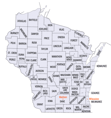 | Adams - Ashland - Barron - Bayfield - Brown - Buffalo - Burnett - Calumet - Chippewa - Clark - Columbia - Crawford - Dane - Dodge - Door - Douglas - Dunn - Eau Claire - Florence - Fond du Lac - Forest - Grant - Green - Green Lake - Iowa - Iron - Jackson - Jefferson - Juneau - Kenosha - Kewaunee - La Crosse - Lafayette - Langlade - Lincoln - Manitowoc - Marathon - Marinette - Marquette - Menominee - Milwaukee - Monroe - Oconto - Oneida - Outagamie - Ozaukee - Pepin - Pierce - Polk - Portage - Price - Racine - Richland - Rock - Rusk - Sauk - Sawyer - Shawano - Sheboygan - St. Croix - Taylor - Trempealeau - Vernon - Vilas - Walworth - Washburn - Washington - Waukesha - Waupaca - Waushara - Winnebago - Wood |