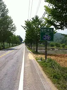 National Route 39 (Korean: 국도 제39호선, Gukdo Je Samsip-gu(39) Hoseon) is a national highway in South Korea. It connects Buyeo to Gongju, Asan, Hwaseong, Siheung, Bucheon, Seoul, Goyang, and Uijeongbu. National Route 39 opened on 14 March 1981[1]