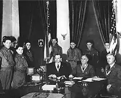 The first national jamboree was held in Washington, D.C. for ten days in July 1937, attended by 25,000 Scouts, most of whom arrived by train. Region campsites were set up around the Washington Monument and Tidal Basin.[1] The event was covered extensively by radio and newspapers. A press tent accommodated 626 news media reporters, photographers, and broadcasters. Sixty-four news releases were issued and the BSA assisted in the making of 11 newsreels and 53 magazine articles.[3]