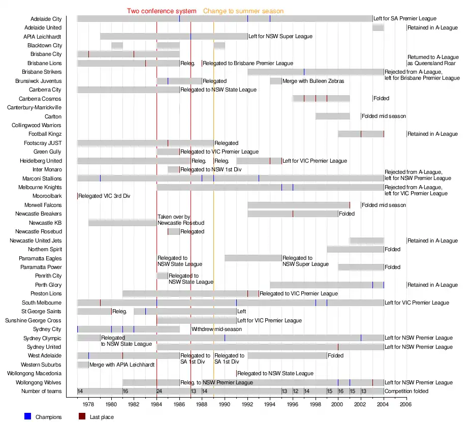 During the history of the NSL the league was contested by a total of 42 teams; 41 based in Australia and one based in New Zealand. Seasons initially ran during the winter seasons, until 1989 when this was changed to the summer season. In 1984, the league was split into two conferences (Northern and Southern) to introduce more teams into the competition; the league returned to a single division in 1987. The competition was known by various names through sponsorships; these names included the Philips Soccer League, Olympic Airways Soccer League, Coca-Cola Soccer League, the Ericsson Cup and the A-League.[2][3][4][5][6]