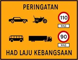Had Laju Kebangsaan (National Speed Limits) is a set of speed limits applicable on Malaysian expressways, federal roads, state roads and municipal roads. The National Speed Limits was enforced on 1 February 1989 following the National Speed Limit Orders 1989 (Perintah Had Laju Kebangsaan 1989).[1] Like any other countries in the world, failing to obey the speed limit on Malaysian roads and expressways is an offence as subject to Malaysian Road Safety Act 1987, which can be fined up to RM300, depending on the difference between the speed limit and the driven speed.