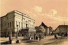 The National Theatre building was demolished in the 1900s. The company moved to the People's Theatre at Blaha Lujza Square in 1908. In the following decades, the company was only a tenant of People's Theatre, and the building's state continually deteriorated. In 1963, authorities decided to demolish it, citing metro line construction as the reasoning.[2] Operation ceased one year later, and the building was demolished on April 23, 1965. The company transferred to the renovated Petőfi Theatre (today is known as Thália), in Nagymező Street. Two years later, it relocated again to the former Magyar Theatre in Hevesi Sándor Square.