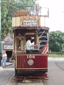 The tram has since covered in excess of 20,000 miles (32,000 km) in passenger service at Crich.[15] It has been restored to represent one of 8 B/4 class cars with an open top and trolley mast. After over twenty years of service, 106 was withdrawn in 2007 and placed on static display. In 2013 it was moved into the workshop for an extensive overhaul. This was completed in June 2015 and the tram is now operational again.