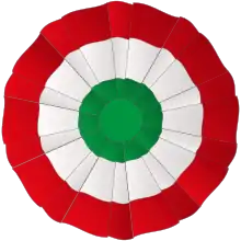 It is one of the national symbols of Italy and is composed of the three colors of the Italian flag with the green in the center, the white immediately outside and the red on the edge: this convention on the position of colors derives from the cockades used in Bologna in 1794 during an attempt of revolt, which had this chromatic composition.[12] The cockade with the red and green inverted position is instead that of Iran.[13]