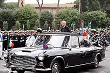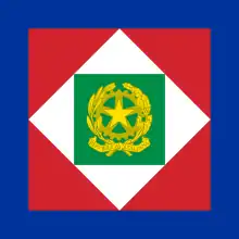 Therefore, it follows the Head of State whenever he leaves the Quirinal Palace, where he is exposed during his presence.[25] The standard is displayed on the means of transport on which the president ascends, outside the prefectures when the president is visiting a city and inside the halls where he acts in an official capacity.[25] The presidential standard is one of the National symbols of Italy.