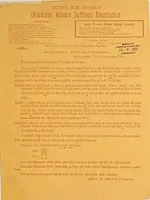 In Oklahoma, Native Americans and non-native suffragists met in 1904 to begin working with one another.[12] The Oklahoma Woman Suffrage Association (OWSA) reached out to Chickasaw people in their own language, encouraging them to support women's suffrage.[12]