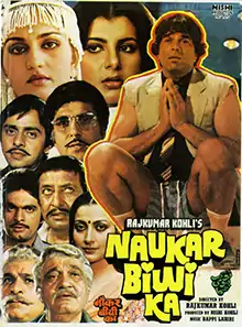 Naukar Biwi Ka is a 1983 Hindi comedy film starring Dharmendra, Raj Babbar, Anita Raj, Reena Roy, Kader Khan, Pran and Om Prakash. It was directed by Rajkumar Kohli. The film became a box office hit. The Anita Raj and Dharmendra pairing became a hit pair after the movie. Anita Raj slapped Dharmendra many times in the movie for a scene, but Dharamendra took it sportingly.[1]
