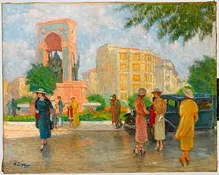 He did manage to obtain some private tutoring from Hoca Ali Riza then, following his father's death in 1902, he quietly enrolled at the Academy.[1] He studied with the Italian Orientalist painter, Salvatore Valeri and the sculptor Osgan Efendi,[2] but had some difficulty adapting to the school's conservative teaching methods and came into conflict with Osman Hamdi Bey, the Director. A meeting with the French painter Paul Signac, who visited Istanbul while sailing around the Mediterranean, may have influenced his desired style.[1] The conflicts continued and, in 1907, when he submitted his final exam pictures, he found his graduation delayed by a year.