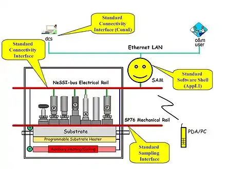 - Adoption of a digital communication bus (NeSSI-bus) that is specifically tailored for process analytics and intended to replace 4-20 mA systems. This bus can handle up to 30 devices. (This bus would be equivalent to a plug-and-play USB bus on a personal computer but with special requirements.)