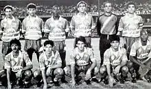 The next season the team led the second division, ensured its promotion. The league now had three groups, with Nea Salamina playing in the Larnaca-Famagusta group. With the conquest of the first position in the group, fought for the promotion with the first teams of the other two groups: the champion of the Limassol-Paphos group, Antaeus Lemesos, and the champion of the Nicosia group, Orfeas, in a new three teams championships. Nea Salamina finished in first place.[38] During the same period, in the 1954–55 Cypriot Cup, excluded from subsequent phases one of the strongest teams of the season, APOEL with 3–2 win in GSE stadium.[39][40][41] After 57 years, in the 2001–02 Cypriot Cup the team repeated this success; after struggling in the second division, it defeated future champion APOEL F.C. 1–0, winning away at GSP Stadium.[42]