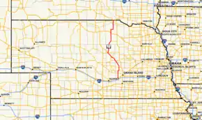 N‑11 begins at Exit 300 of I‑80, which is also the exit for NE Spur 40D. It goes north through farmland into Wood River, where it crosses over U.S. Route 30 in Nebraska (US 30) without an interchange. Access to US 30 is available via Link 40G 0.5 miles (0.8 km) to the north. It continues north through Cairo, then meets Nebraska Highway 58. The two highways run concurrent, heading northeast to Dannebrog, where they separate. N‑11 proceeds north to Elba, then turns northwest on an alignment that parallels the North Loup River. It passes through Ord and Burwell, then turns north after passing Nebraska Highway 91. N‑11 continues north into areas of prairie and meets U.S. Route 20 in Atkinson. N‑11 goes north into farmland some more, briefly goes east, then turns north to go through Butte, where it meets Nebraska Highway 12 (N‑12). After a brief concurrency with N‑12, N‑11 turns north and goes into South Dakota, where the road continues as South Dakota Highway 43.[1][3]