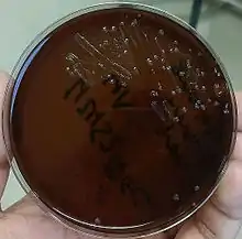 N. gonorrhoeae is usually isolated on Thayer-Martin agar (or VPN) agar in an environment enriched with 3-7% carbon dioxide.[10] Thayer-Martin agar is a chocolate agar plate (heated blood agar) containing nutrients and antimicrobials (vancomycin, colistin, nystatin, and trimethoprim). This agar preparation facilitates the growth of Neisseria species while inhibiting the growth of contaminating bacteria and fungi. Martin Lewis and New York City agar are other types of selective chocolate agar commonly used for Neisseria growth.[10] N. gonorrhoeae is oxidase positive (possessing cytochrome c oxidase) and catalase positive (able to convert hydrogen peroxide to oxygen).[10] When incubated with the carbohydrates lactose, maltose, sucrose, and glucose, N. gonorrhoeae will oxidize only the glucose.[10]
