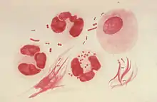 | Gram-stain of gonococcal urethritis. Note distribution in neutrophils and presence of both intracellular and extracellular bacteria. (CDC) | |