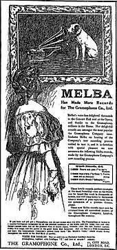 Melba made numerous gramophone (phonograph) records of her voice in England and America between 1904 (when she was already in her 40s) and 1926 for the Gramophone & Typewriter Company[63] and the Victor Talking Machine Company. Most of these recordings, consisting of operatic arias, duets and ensemble pieces and songs, have been re-released on CD.[64] The poor audio fidelity of the Melba recordings reflects the limitations of the early days of commercial sound recording. Melba's acoustical recordings (especially those made after her initial 1904 session) fail to capture vital overtones to the voice, leaving it without the body and warmth it possessed – albeit to a limited degree – in life. Despite this, they still reveal Melba to have had an almost seamlessly pure lyric soprano voice with effortless coloratura, a smooth legato and accurate intonation.[64] Melba had perfect pitch; the critic Michael Aspinall says of her complete London recordings issued on LP, that there are only two lapses from pitch in the entire set.[65] Like Patti, and unlike the more vibrant-voiced Tetrazzini, Melba's exceptional purity of tone was probably one of the principal reasons why British audiences, with their strong choral and sacred music traditions, idolised her.[66]