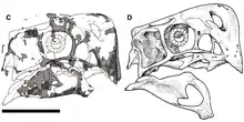 The jaws of Nemegtomaia were toothless, and like other oviraptorid dinosaurs, it had a short snout with a deep, robust, and somewhat parrot-like beak. It had a hard palate formed by the premaxillae, vomers, and maxillae, like other oviraptorids. The palate was strongly concave (downwards-projecting), and had a cleft on the central part. As in other oviraptorids, it had a pair of tooth-like projections on the palate that were directed downwards (a feature that has been called "pseudo-teeth"). Nemegtomaia had small foramina (openings) on the sides of the suture (joint) between the premaxillae at the front of the snout, which may have been nutrient openings (and which indicate the presence of a keratinous bill). The lower jaw was short and deep, with a convex lower surface, and reached 153 mm (6 in) in length. The dentary bone of the lower jaw reached 50 mm (2 in) at its highest point. The mandibular symphysis (where the two-halves of the lower jaw connected) was short, deep, and very pneumatised (with air-spaces). The mandibular fenestra was large and was located at the front part of the lower jaw.[1][2][10][3] As in most other oviraptorids, the front of the lower jaw was down-turned.[11]