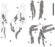 Longrich and colleagues pointed out that the robust forelimbs and enlargement of a single finger in heyuannine oviraptorids is similar to that seen in modern animals that eat ants and termites, such as anteaters and pangolins, but the morpholology of heyuannine jaws does not support them being insectivorous. The researchers found that the function of heyuannine forelimbs was unclear, but suggested that they could have been used for scratching, tearing, or digging, though not prey capture.[13]