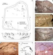 The nesting skeleton preserves parts of the skull, both scapulae, the left arm and hand, the right humerus, the pubic bones, the ischia, the femora, the tibiae, fibulae, and the lower portions of both feet. This specimen was found less than 500 m (1640 ft) from the holotype, and was of the same size; it was assigned to Nemegtomaia due to its similar anatomical features and geographical proximity. It was collected in a single block so that the spatial relationship of the bones and eggs would be preserved. The second specimen, MPC-D 107/16, was found by the American palaeontologist Nicholas R. Longrich in the Nemegt Formation, and consists of the hands, a partial left ulna and radius, ribs, a partial pelvis, and both femora. This specimen was 35% smaller than the others, and was assigned to Nemegtomaia due to its hands having the same characteristics as those of specimen MPC-D 107/15. It is possible that the hands may have belonged to a different individual, as they were not found articulated with the rest of the skeleton (other oviraptorids are known from quarries with multiple skeletons), but this cannot be confirmed.[2]