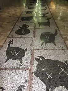 In even worse conditions is Quinchamalí (1958) at the Juan Esteban Montero Gallery: the paint of the mural is peeling and warping due to the humidity. The art restorer Carolina Broschek maintains that the mural can be saved, but the owner of the building on which it is painted, Yusif Tala, opined that the Nemesio Antúnez Foundation should take care of the painting or move it to another place, as has no interest in preserving it.[2] In the same gallery, besides the mural, Antúnez installed floor mosaics which are still in perfect condition.