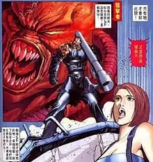 The Nemesis appears in a 1999 Hong Kong manhua adaptation of Resident Evil 3 by Lee Chung Hing, Biohazard 3: Last Escape, which is named after the game's Japanese title. The 27-issue series adds to the Nemesis' backstory, detailing its origin by showing the infection and transformation of the original Tyrant by the Nemesis parasite. Some elements are changed for its design, such as the Nemesis retaining both eyes initially, and then losing the right eye and gaining cranial staples only after an encounter with Jill.[24] The comic also introduces characters from Resident Evil 2 into the storyline, which results in a face-off between the Nemesis and the mutated William Birkin towards the end of the series.[25]