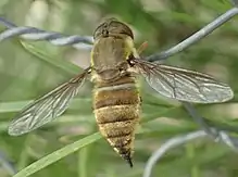 Nemestrinidae, or tangle-veined flies is a family of flies in the superfamily Nemestrinoidea, closely related to Acroceridae. The family is small but distributed worldwide, with about 300 species in 34 genera. Larvae are endoparasitoids of either grasshoppers (Trichopsideinae) or scarab beetles (Hirmoneurinae). Some are considered important in the control of grasshopper populations. Adults are often observed on flowers.